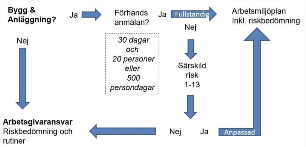 Den som låter utföra ett byggnads- eller anläggningsarbete är ansvarig för att en arbetsmiljöplan upprättas INNAN arbetsplatsen etableras om arbetet är av sådan typ av förhandsanmälan krävs eller om någon av följande riskmoment kommer vara närvarande: