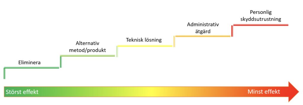 Då åtgärder för riskeliminering eller riskminimering planeras är det viktigt att fundera kring vilken lösning som ger bästa effekt. Generellt sett strävar vi efter att i första hand eliminera risken helt och som sista utväg använda personlig skyddsutrustning.